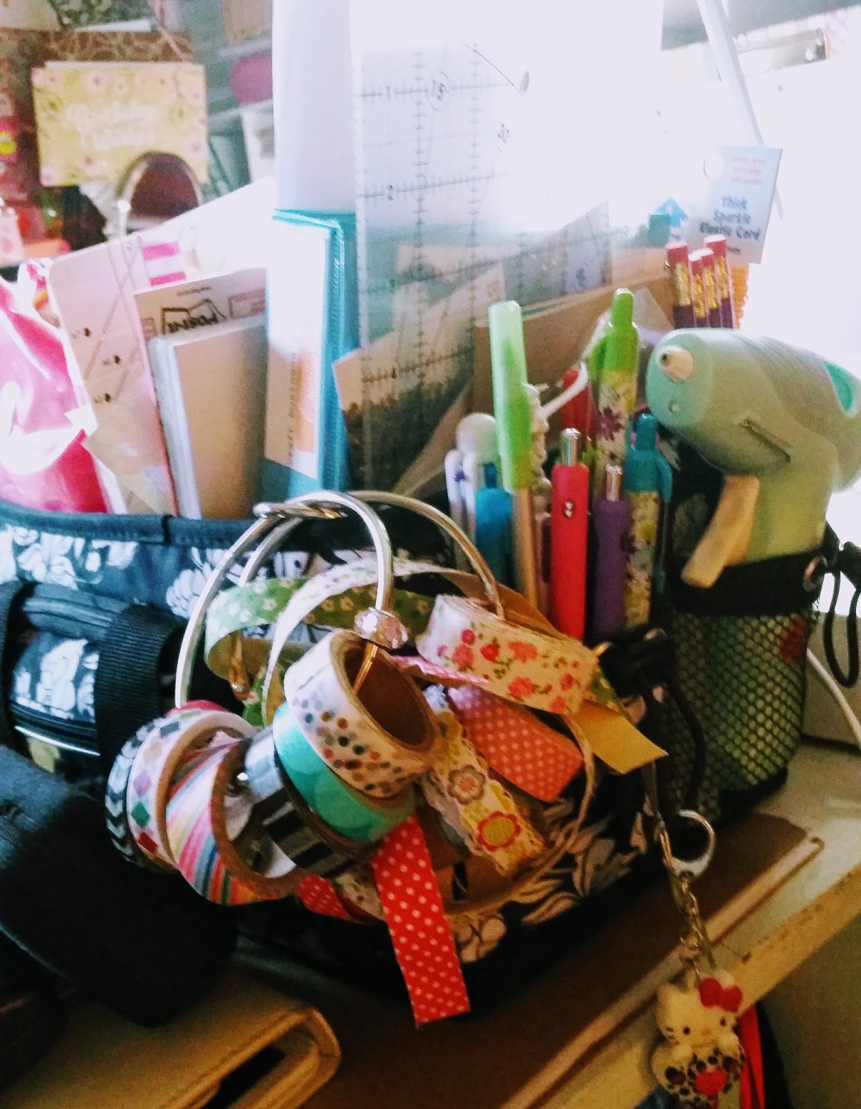 I'm on the go right now with work and a show I'm in (9 to 5 The Musical), so this notebook is fully loaded and keeping me sane. It has two six-month planners, a list book with every list I need for every thing, a folder packed with diecuts and scraps, a dashboard I made to keep extra posties and washi, a business book with plans and ideas, and a verse and phrase art journal to play in. Plus I have extra Ink Joy gel pens hooked on the side there--I really love those gel pens they've come out with.